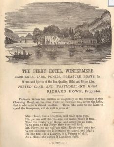 Poet Close’s Grand Lake Book, published in 1869, arose from John’s custom of spending time during the summer at Bowness on Windermere ‘under the yews’ selling his books to the well-heeled clientele of the Lakeland hotels. The book includes a number of advertisements from local businesses; those for the hotels are accompanied by short poems in praise of the proprietors and staff – no doubt seen by Poet CLOSE as a guarantee of good sales in those establishments. The example shown here relates to the Ferry Hotel, Windermere.